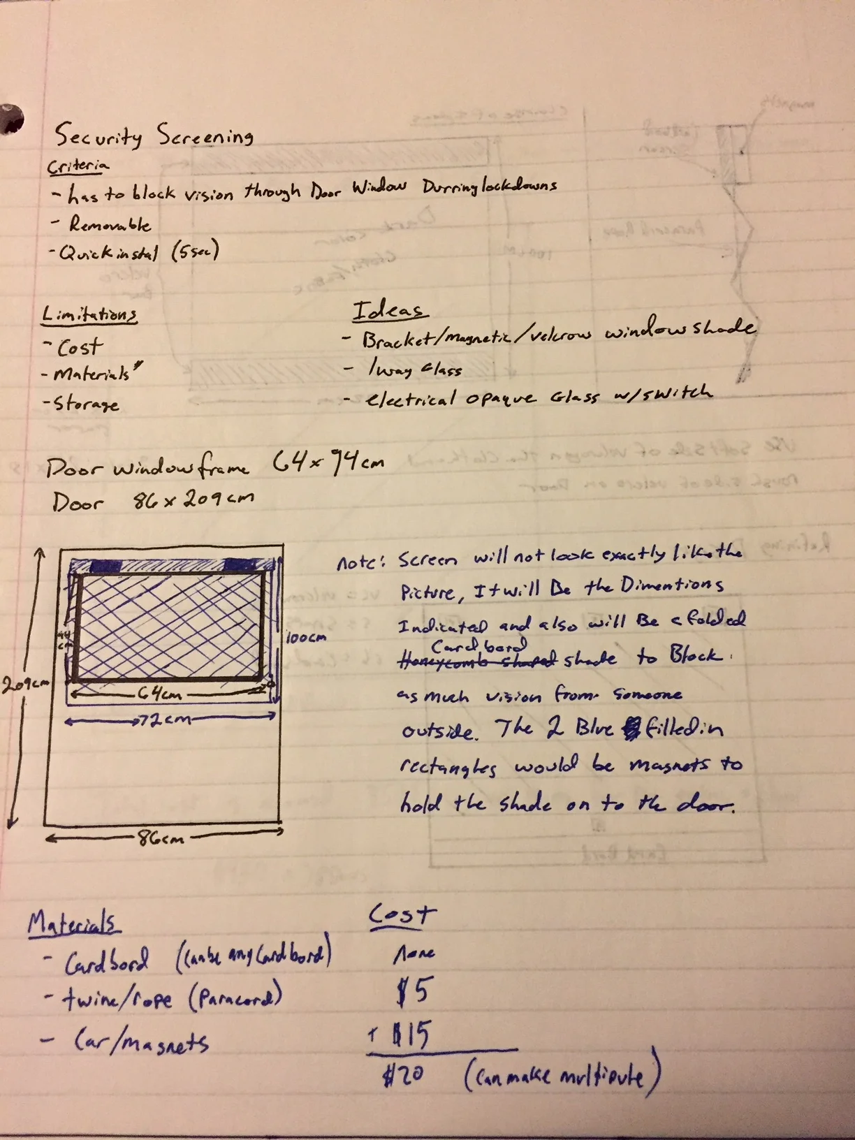 Some of the first projects of the class focused on one main field of engineering at a time. The first project of the year was to design and build a screen to put over the classroom door windows in case of emergencies. Leugers gave his class a list of requirements that this screen must be able to do: block vision through door window, removable, and quick installation. With these requirements there were also some limitations that came with the project: budget, materials, and storage.